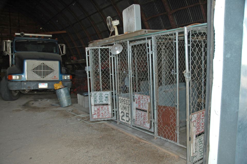 When I was in town for our September clinic, I met the person that runs the Sisseton City pound. Mark is a volunteer that is working to make sure the animals are safe and healthy while they are at the pound, and that they get out safely in to rescue. I had seen the pound from the outside before, but finally got a chance to go inside. The building is actually a city maintenance garage. There is a garage door, but no windows, no heat or A/C. There are 4 dog kennels just inside the door. Mark has zero budget for his work at the pound. He has recycled roadway signs to cover up the holes that had been chewed in the kennel fencing, and built wooden platforms for sleeping areas, so the dogs don’t need to lay on the concrete. He has also set up a dog crate to use in case cats are brought to the pound. He is doing some great work, but really needed some help!